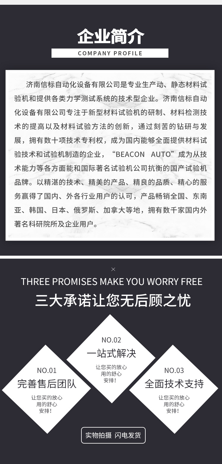 濟南信標自動化設備有限公司主要生產:動靜態萬能疲勞試驗機,接骨板彎曲試驗機,縫合線拉伸疲勞試驗機,髖膝關節磨損試驗機,電子萬能試驗機、液壓萬能試驗機、巖石三軸、四軸,電液拉力試驗機,材料試驗機,高低溫蠕變,高低頻疲勞,拉伸、扭轉、杯突等二十多個系列兩千多個的品種。